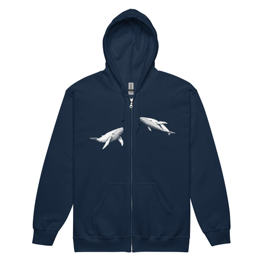 Whales Zip Up Fleece Hoodie, Humpback Marine Beach Ocean Sea Full Zipper Pocket Men Women Unisex Aesthetic Graphic Cotton Hooded Sweatshirt