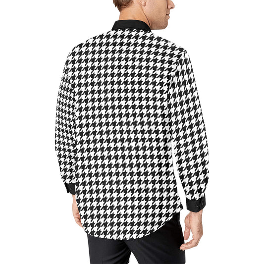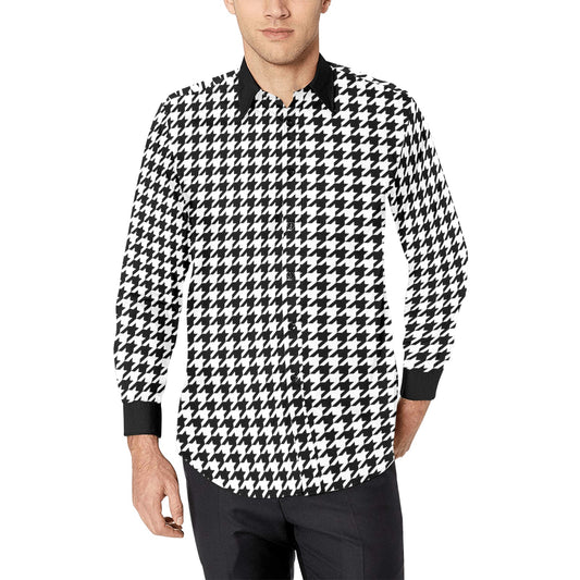 Houndstooth Long Sleeve Men Button Up Shirt, Pattern Black White Print Dress Buttoned Collar Dress Shirt with Chest Pocket