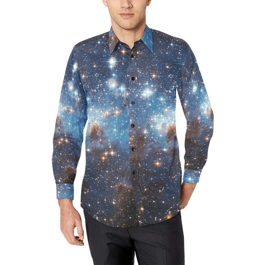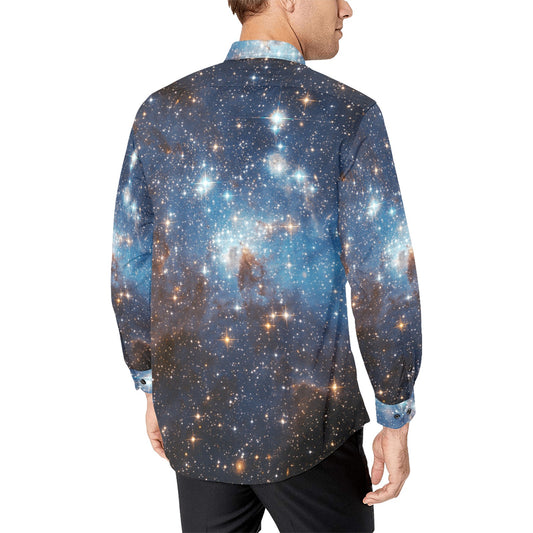 Galaxy Long Sleeve Men Button Up Shirt, Space Themed Stars Universe Cosmos Print Unique Buttoned Collar Dress Shirt with Chest Pocket