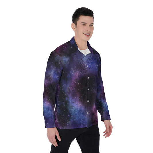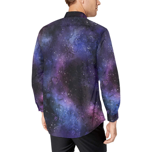 Galaxy Long Sleeve Men Button Up Shirt, Space Nebula Geeky Stars Print Dress Buttoned Collared Casual Dress Shirt with Chest Pocket