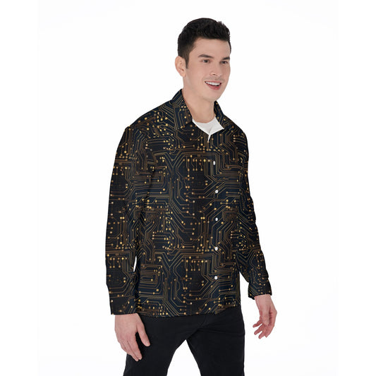 Engineer Men's Lapel Collar Shirt, Circuit Board Programmer Robot Coder Long Sleeve Button Up Dress Nerd Office Plus Size