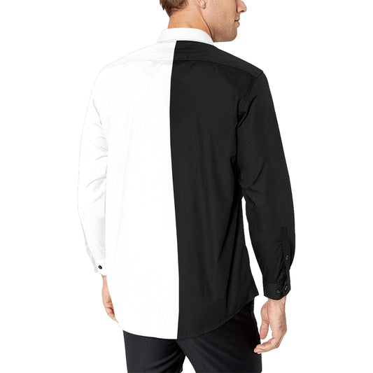 Half Black Half White Long Sleeve Men Button Up Shirt, Color Block Split Two Tone Combo Print Buttoned Collared Dress Shirt Chest Pocket