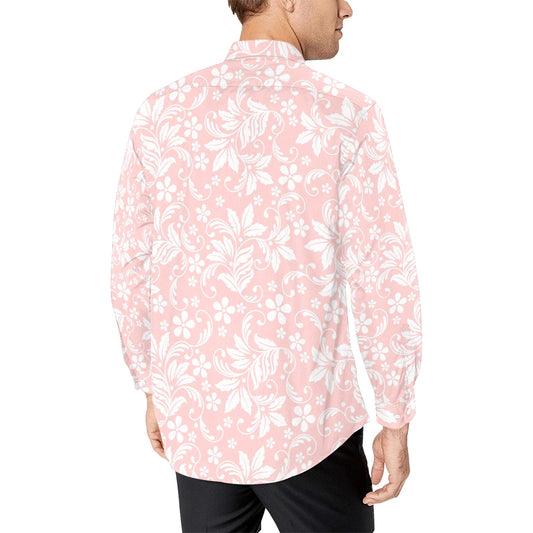 Pink Floral Long Sleeve Men Button Up Shirt, Flowers Print White Casual Buttoned Collared Designer Dress Shirt with Chest Pocket