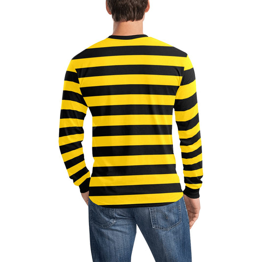Black and Yellow Striped Men Long Sleeve TShirt, Vintage Retro Stripe Bee Costume Stripes Crewneck Unisex Women Designer Tee