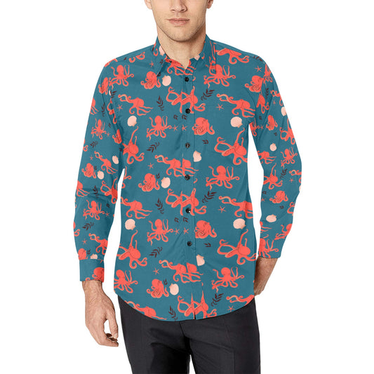 Octopus Men Button Up Shirt, Long Sleeve Kraken Marine Animals Beach Sea Fish Print Dress Buttoned Collar Dress Shirt with Chest Pocket