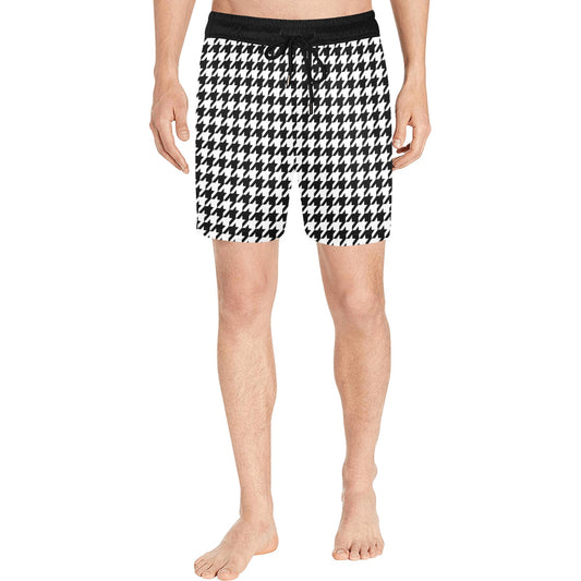 Houndstooth Men Mid Length Shorts, Black White Pattern Beach Swim Trunks Pockets & Mesh Drawstring Casual Bathing Suit Summer Plus Size Male