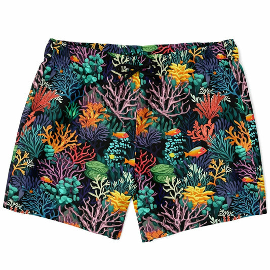 Coral Reef Men Swim Trunks, Sea Ocean Tropical Mid Length Shorts Beach Surf Swimwear Front Pockets Mesh Lining Drawstring Bathing Suit