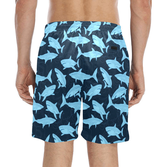 Navy Shark Men Swim Trunks, Blue Mid Length Shorts Beach Front and Back Pockets Mesh Linen Drawstring Casual Bathing Suit Summer Plus Size