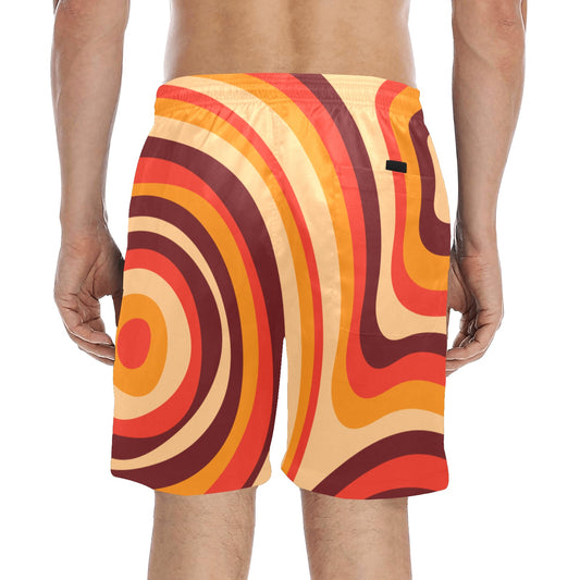 Vintage Men Mid Length Shorts, Retro Groovy Brown Orange 70s Beach Swim Trunks Front Back Pockets Mesh Drawstring Casual Bathing Suit Summer