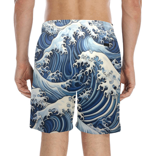 Japanese Waves Men Swim Trunks, Ocean Blue 7" Inseam Shorts Beach Pockets Mesh Lining Drawstring Casual Bathing Suit Plus Size Swimwear