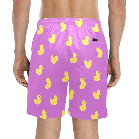 Pink Rubber Duck Men Swim Trunks, Yellow Mid Length Shorts Beach Front Back Pockets Mesh Linen Drawstring Bathing Suit Summer Plus Size