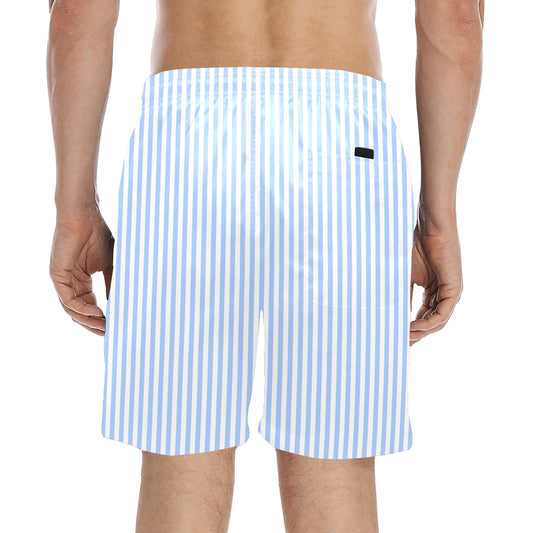 Blue White Striped Men Swim Trunks, Mid Length Shorts Beach Pockets Mesh Lining Drawstring Boys Casual Bathing Suit Plus Size Swimwear