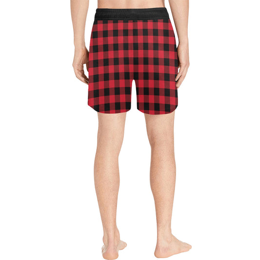 Red Buffalo Plaid Men Shorts, Black Check Mid Length Beach Swim Trunks with Pockets & Mesh Drawstring Check Casual Bathing Suit Summer