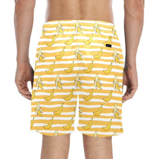 Banana Men Mid Length Shorts, Striped Yellow Funny Beach Swim Trunks Front and Back Pockets Mesh Drawstring Boys Casual Bathing Suit Summer