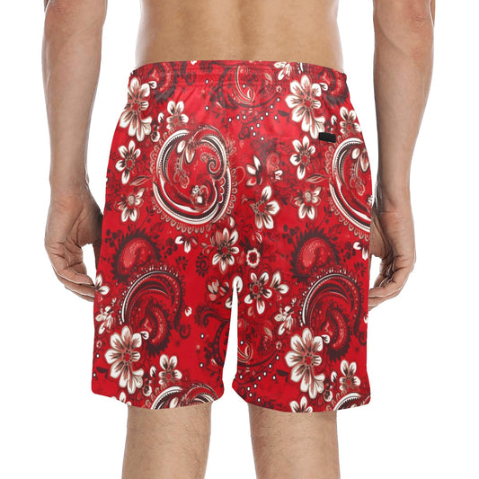 Red Bandana Men Swim Trunks, Paisley Mid Length Shorts Beach Pockets Mesh Lining Drawstring Boys Casual Bathing Suit Plus Size Swimwear