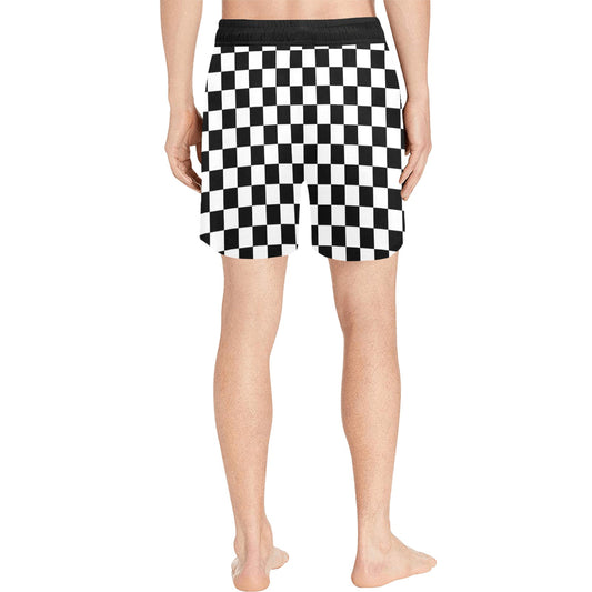 Checkered Men Mid Length Shorts, Black White Check Beach Swim Trunks with Pockets & Mesh Drawstring Boys Casual Bathing Suit Summer