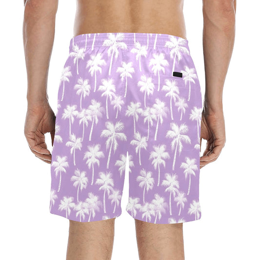 Lilac Palm Tree Men Mid Length Shorts, Lavender Purple Beach Swim Trunks Front Back Pockets Mesh Drawstring Boys Casual Bathing Suit Summer