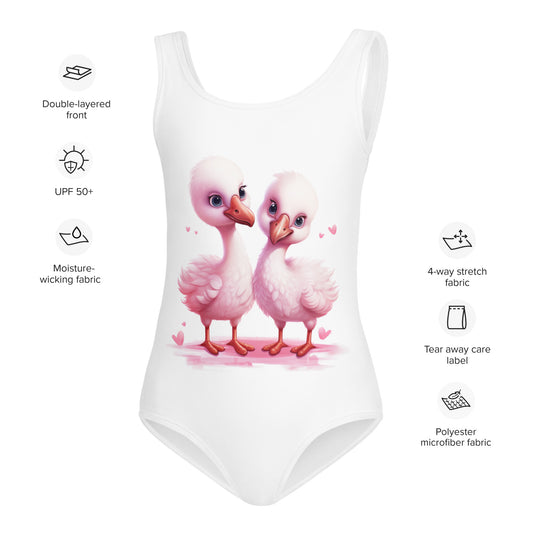 Pink Baby Flamingos Little Girl Kids Swimsuits (2T - 7), Cute White Toddler One Piece Bathing Suit Swimming Swim Children Swimwear