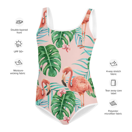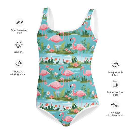 Pink Flamingo Girls Swimsuits (8 - 20), Tropical Cute Kids Jr Junior Tween Teen One Piece Bathing Suit Young Swimwear