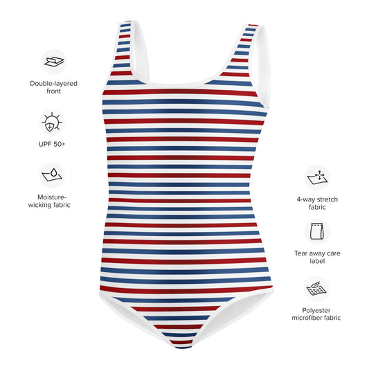 Red White Blue Striped Girls Swimsuits (8 - 20), Cute Kids Jr Junior Tween Teen Teenage One Piece Bathing Suit Young Swimwear