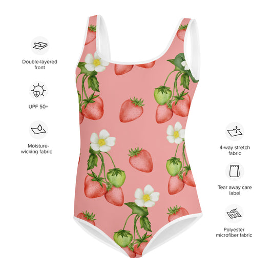 Strawberry Pink Girls Swimsuits (8 - 20), Flowers Summer Fruit Cute Kids Jr Junior Tween Teen One Piece Bathing Suit Young Swimwear
