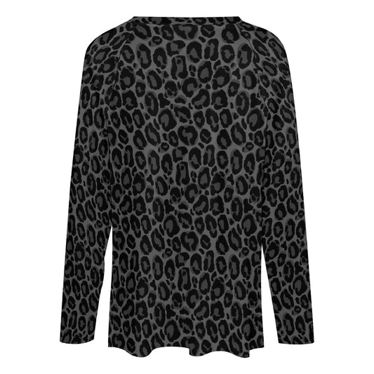 Black Leopard Women Long Sleeve Tshirt loose fit, Gray Animal Print Relaxed V-neck Designer Graphic Aesthetic Ladies Female Tee Top Shirt
