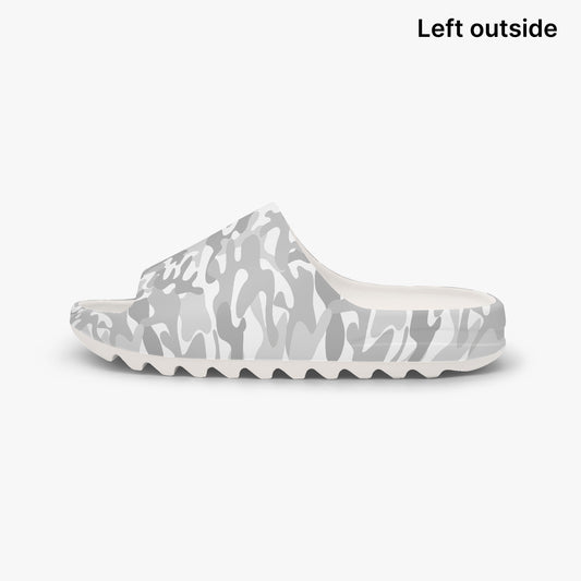 White Camo Men Slides Sandals, Grey Snow Camouflage Sliders Men Women Designer Shoes Flat Slippers Casual Flip Flops Comfortable Slip On