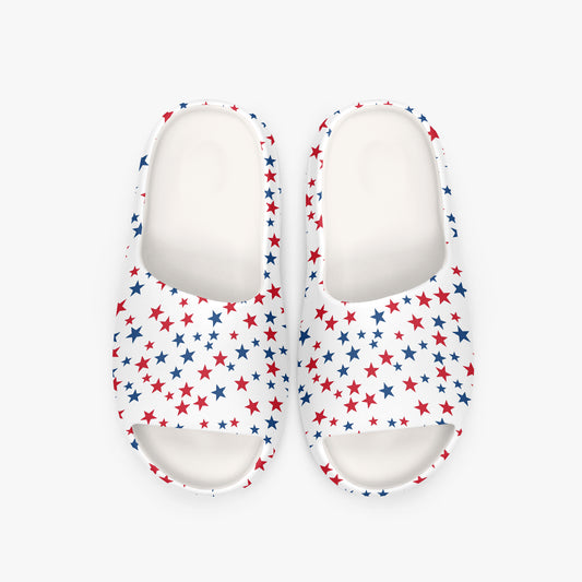 Red White Blue Stars Men Slides Sandals, Patriotic Designer Sliders Beach Shower Shoes Flat Slippers Vegan Casual Comfortable Slip On