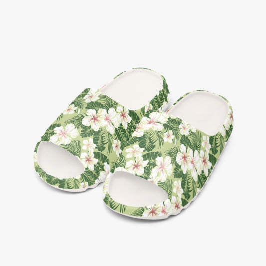 Tropical Men Slides Sandals, Hibiscus Green White Hawaiian Designer Sliders Beach Shower Shoes Flat Slippers Casual Slip On Comfortable