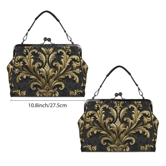 Baroque Kiss Lock Purse Handbag, Retro Black Ornate Gold Print Vegan Leather Vintage Designer Shoulder Crossbody Top Handle Clasp Bag