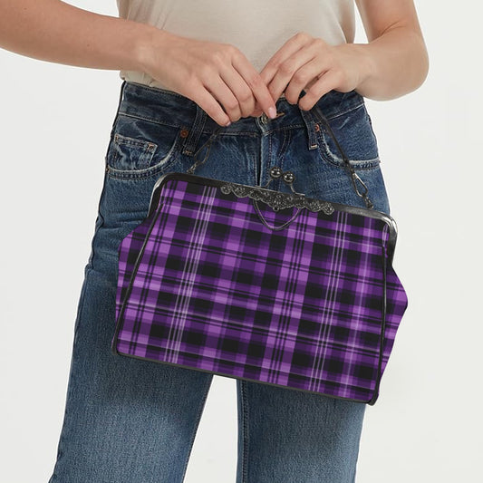 Purple Kiss Lock Purse Handbag, Plaid Tartan Print Vegan Leather Vintage Designer Shoulder Crossbody Top Handle Clasp Bag