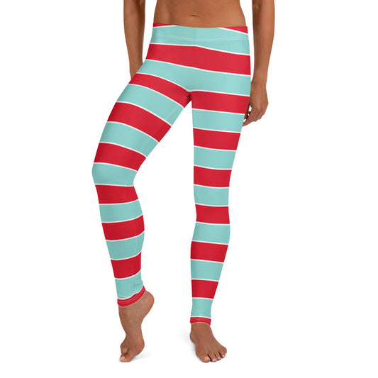 Candy Cane Leggings, Christmas Red Aqua Blue Graphic Printed Striped Winter Yoga Wear Clothing Women's Activewear Style Holiday Xmas Gift