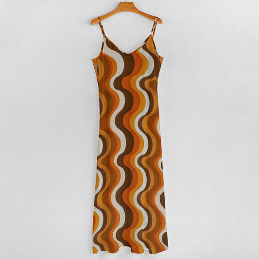 70s Wavy Stripes Maxi Dress, Retro Vintage Orange Long Spaghetti Straps Flowy Women Sleeveless Designer Plus Size Cocktail Party Summer