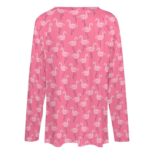 Pink Flamingo Women Long Sleeve Tshirt loose fit, Bird Animal Relaxed V-neck Designer Graphic Aesthetic Ladies Female Tee Top Shirt