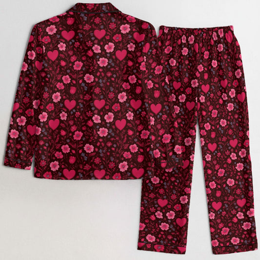 Red Pink Hearts Women Pajamas Set, Floral Flowers Valentine's Day Ladies Silk Sleepwear Long Sleeve Sleep Shirt Plus Size Designer PJs