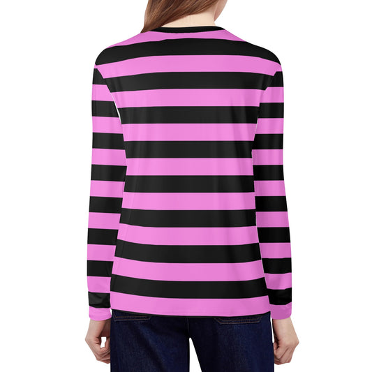 Black and Pink Striped Women Long Sleeve Tshirt, Designer Graphic Aesthetic Crew Neck Ladies Stripes Tee Shirt Top