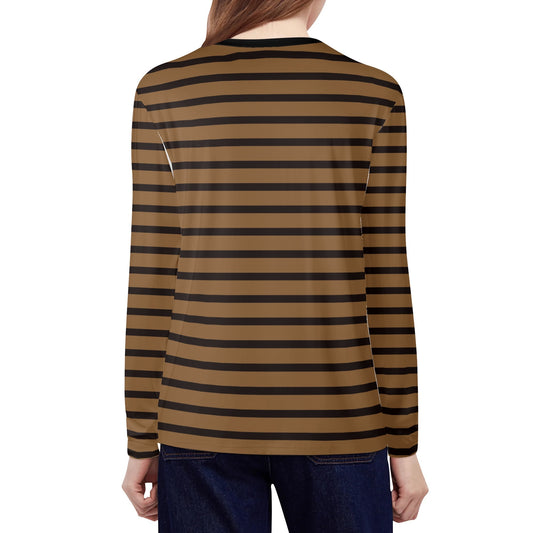 Black Brown Striped Women Long Sleeve Tshirt, Tan Camel Broad Stripe Designer Graphic Aesthetic Crew Neck Ladies Tee