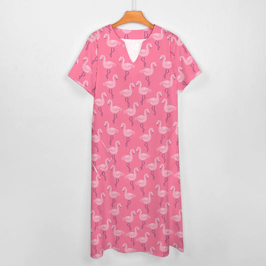 Pink Flamingo Women Maxi Dress, V-Neck Print Short Sleeve Evening Summer Cocktail Ladies Handmade Designer Plus Size Party Outfit Pockets