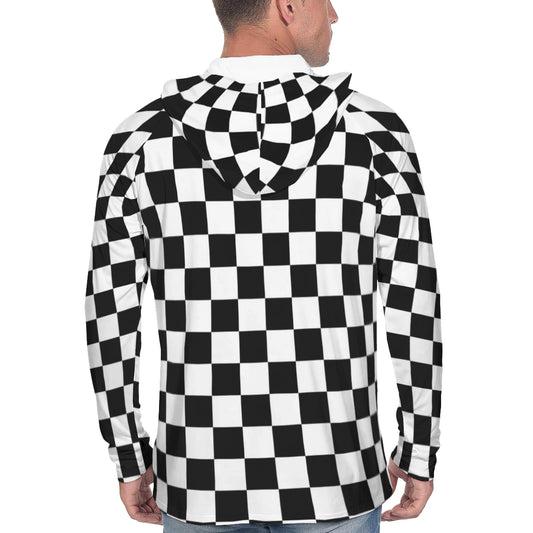 Checkered Men Sun Hoodie, Black White Check Summer UPF 50 UV Protection SPF Pullover Lightweight Long Sleeve Sports Golf Breathable Pockets