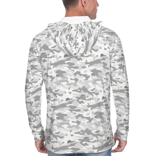 White Camo Men Sun Hoodie, Grey Camouflage Summer UPF 50 UV Protection SPF Pullover Lightweight Long Sleeve Golf Breathable Hooded Pockets
