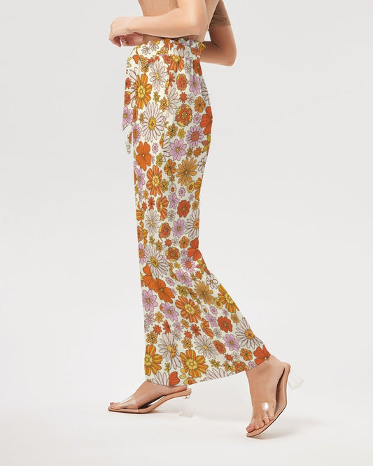 Retro Flowers Women Wide Leg Pants Pockets, Pink Orange Vintage Yoga Trousers High Waisted Ladies Comfy Drawstring Lounge Flowy Work Summer