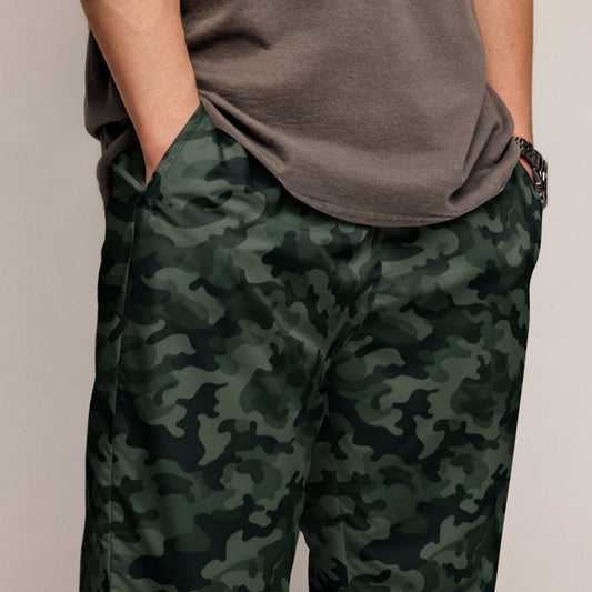 Dark Green Camo Track Pants, Camouflage Men Women Zip Pockets Quick Dry Mesh Lining Lightweight Elastic Waist Windbreaker Joggers Bottoms