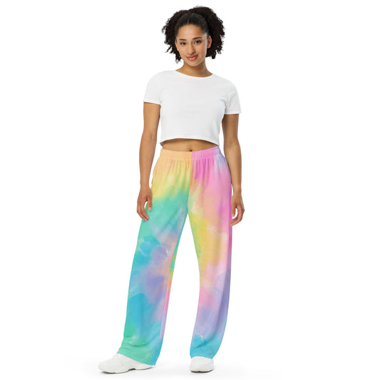 Pastel Tie Dye Wide Leg Pants Pockets, Hippie Women Men Yoga Trousers Ladies Boho Comfy Drawstring Lounge Flowy Festival Work Plus Size