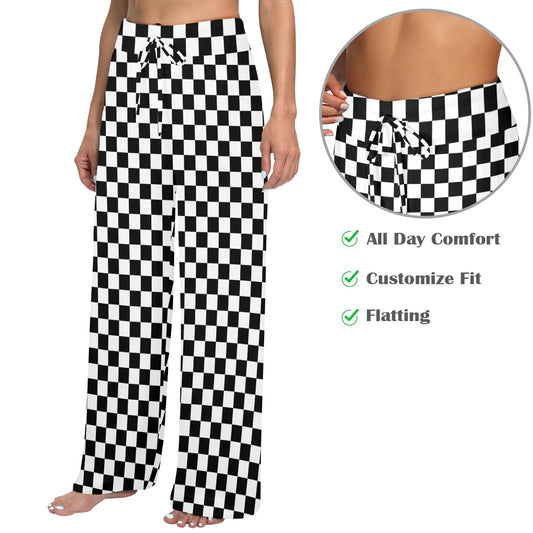 Checkered Women Wide Leg Pants Pockets, Black White Check Racing Yoga Trousers High Waisted Ladies Comfy Drawstring Lounge Flowy Summer