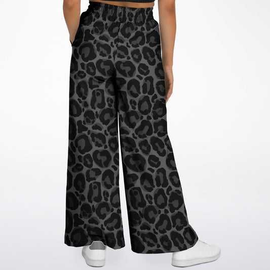 Black Grey Leopard Women Wide Leg Pants Pockets, Cheetah Animal Print Yoga Trousers High Waisted Ladies Comfy Drawstring Lounge Flowy Summer
