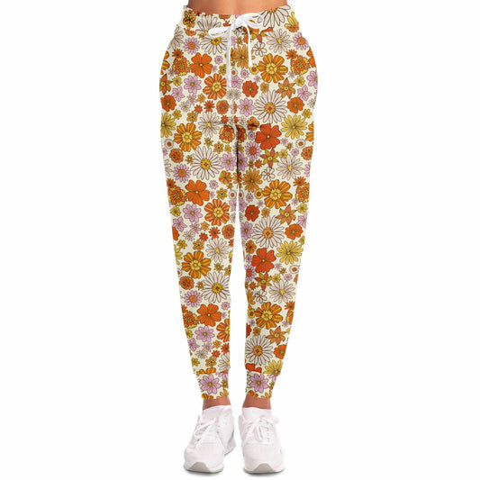 Retro Floral Joggers Sweatpants Pockets, Pink Orange Vintage Flowers Women Men Female Ladies Fleece Comfy Sweats Pants Loungewear Bottoms