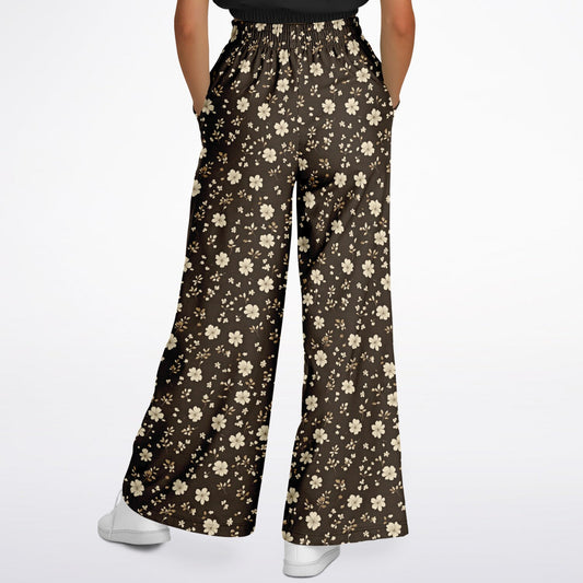 Brown Floral Wide Leg Jogging Pants, Flowers Ditsy Flare Sweatpants Pockets Women Flared Sweats Cotton Fleece Ladies Joggers Loungewear