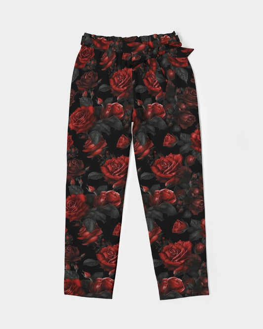 Red Roses Women Tapered Pants Pockets, Floral Flower Black Belted Dress Trousers High Waisted Ladies Comfy Lounge Work Travel Boho Summer