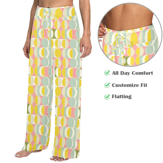 Mid Century Modern Women Wide Leg Pants Pockets, Retro Yellow 70s Yoga Trousers High Waisted Ladies Comfy Drawstring Lounge Flowy Summer