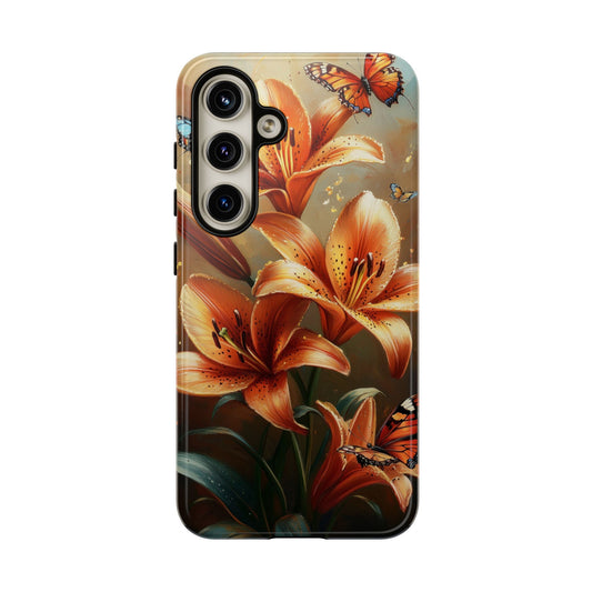 Tiger Lily Tough Phone Case, Flowers Floral Butterfly iPhone 16 15 14 13 Pro Max 12 11 8 Plus X XR XS Galaxy S24 S23 S22 S21 Google Pixel
